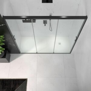 Comment est ta salle de bain ? Est-elle large ou y a-t-il des obstacles qui rendent difficile l’accès à la douche ? Si l’espace est quelque peu réduit et qu’il y a des toilettes ou des meubles près de l’ouverture du paravent, le système de trois portes coulissantes avec ouverture des deux côtés est fortement recommandé pour votre cas. Lorsque les feuilles sont ouvertes, elles se cachent l’une derrière l’autre, laissant un espace d’entrée des deux tiers du trou total.