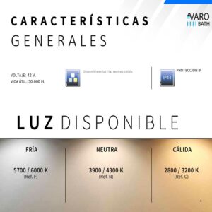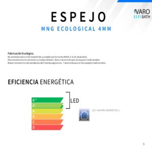 Il est fabriqué avec un verre lisse dans une structure avec un cadre en ABS à l’arrière. La puissance varie selon la taille du miroir. Vous avez la possibilité de le choisir en trois types de lumières ; Lumière froide (6000ºK), Lumière neutre (4500ºK), Lumière chaude (3200ºK).