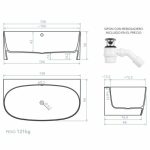- Cette baignoire non encastrée a les dimensions suivantes : 158 cm de long x 86 cm de large x 58 cm de haut. Ils ne peuvent pas être modifiés. S’agissant d’un produit standard, il est livré rapidement, en 3, 4 ou 5 jours maximum.
