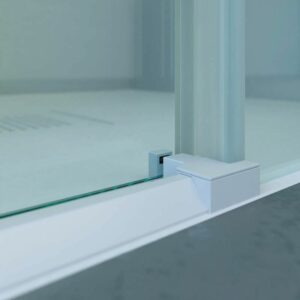 La paroi de douche angulaire BASIC a quatre feuilles de verre trempé de 6 mm d’épaisseur (pour le moment uniquement disponible dans une finition incolore), elle n’inclut pas de guide inférieur et elle inclut un anticalcaire en standard. De plus, parmi les nouveautés que ce modèle intègre, il y a des profils latéraux plus étroits et un design raffiné, ainsi qu’un système de montage très simple pour que tout client puisse placer sa nouvelle cloison à la maison s’il le souhaite.