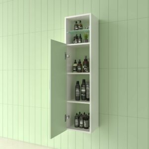 Il est composé d’une porte avec une étagère en verre au-dessus et une étagère en bois en bas au centre afin de pouvoir ranger tous vos produits de salle de bain.