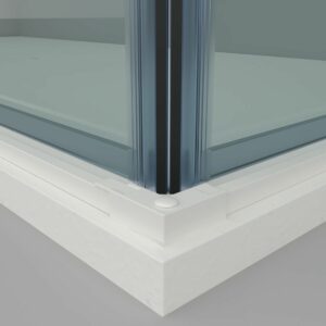 Cabine de douche carrée FLARE ouverture angulaire 2 fixes-2 portes coulissantes. Pas de profil inférieur. Avec traitement anti-calcaire. Fini BLANC MAT