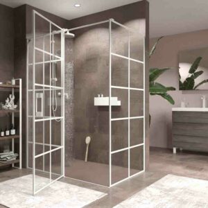 - Paroi de douche composée d’une façade fixe et d’une porte battante avec un côté fixe.
