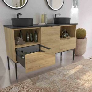 - Avec jambes : choisissez un meuble de salle de bain avec pieds si vous souhaitez un design attrayant et une stabilité totale pour votre meuble sous lavabo.
