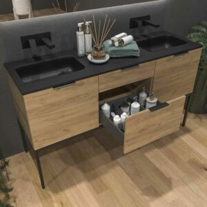 - Avec jambes : choisissez un meuble de salle de bain avec pieds si vous souhaitez un design attrayant et une stabilité totale pour votre meuble sous lavabo.
