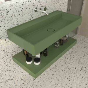 Dans les petites salles de bains, les lavabos suspendus sont très pratiques. Ils font leur travail sans recharger la pièce ni occuper la partie basse. Vous pouvez placer une étagère inférieure en option pour le placement d’un panier ou de serviettes si vous le souhaitez. Ou laissez-le libre pour nettoyer confortablement le sol de la salle de bain.