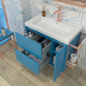 Installation: Le meuble il est servi monté y Il est accompagné de pieds en aluminium finis en noir, blanc, or, or rose, chrome et cuivre. Ces pieds seront décorés de la couleur du meuble de salle de bain.