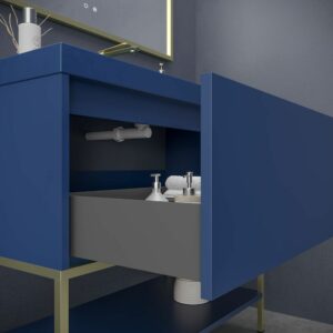 Soyez le premier à laisser votre avis sur “Meuble de salle de bain ELEN sur pieds 1 tiroir – 1 étagère inférieure BLEU COBALT / OR MAT”