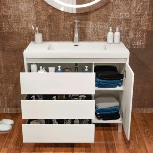 • Ce meuble a 3 tiroirs avec guides cachés et 1 porte à fermeture amortie . Le système de fermeture en douceur amorti vous permet d’avoir à peine à faire un effort pour ouvrir ou fermer votre tiroir et tout est égal. Ça va t’enchanter. Faites également attention à son incroyable poignée incrustée.