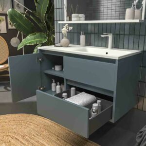 - Fácil de instalar: tout est déjà assemblé. Étant un meuble suspendu, vous pouvez l’avoir bien fixé au mur, en profitant de suffisamment d’espace pour nettoyer en dessous et d’une consistance parfaite.
