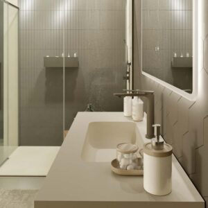 - Ajoutez vos meubles auxiliaires, colonne de salle de bain, luminaires ou miroir pour créer un environnement harmonieux et uniforme.