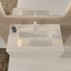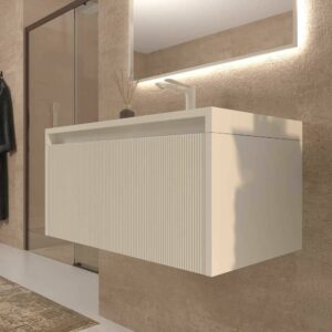 Il est fabriqué en MDF, un matériau très résistant et durable pour que le meuble ait une longue durée de vie. La peinture cette base d’ions argent est projetée sur le module antibactérien ce qui le rend plus résistant. La façade à lattes en fait un meuble de salle de bain design unique sur le marché national et international.
