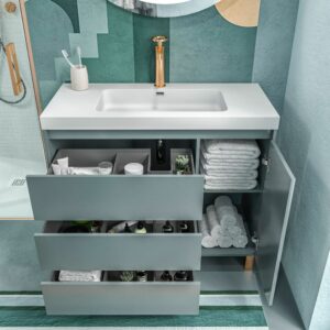- Ce meuble a 3 tiroirs avec guides cachés et 1 porte à fermeture amortie . Le système de fermeture en douceur amorti vous permet d’avoir à peine à faire un effort pour ouvrir ou fermer votre tiroir et tout est égal. Ça va t’enchanter. Faites également attention à son incroyable poignée incrustée.