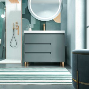 - C’est un meuble de salle de bain avec pieds, une option idéale pour ceux qui recherchent un meuble stable, facile à installer et avec des pieds intégrés pour une grande résistance.