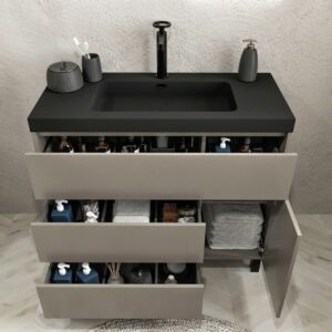 - Ce meuble a 3 tiroirs avec guides cachés et 1 porte à fermeture amortie . Le système de fermeture en douceur amorti vous permet d’avoir à peine à faire un effort pour ouvrir ou fermer votre tiroir et tout est égal. Ça va t’enchanter. Faites également attention à son incroyable poignée incrustée.