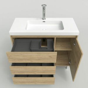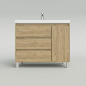 - C’est un meuble de salle de bain avec pieds, une option idéale pour ceux qui recherchent un meuble stable, facile à installer et avec des pieds intégrés pour une grande résistance.
