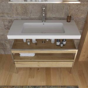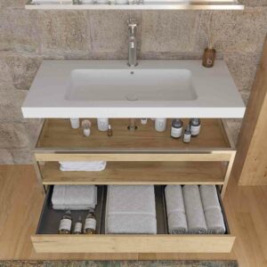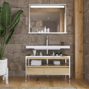 Vous pouvez acheter le meuble de salle de bain avec le miroir assorti, qui viendra dans une taille proportionnelle à la largeur que vous choisissez pour le meuble. De plus, vous pouvez ajouter d’autres accessoires pour avoir une salle de bain bien combinée.