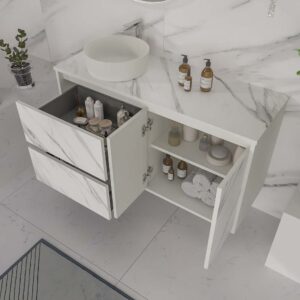 - Fácil de instalar: Tout est déjà assemblé. Étant un meuble suspendu, vous pouvez l’avoir bien fixé au mur, en profitant de suffisamment d’espace pour nettoyer en dessous et d’une consistance parfaite.