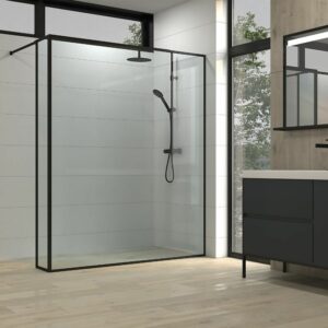 Su beau profilage minimaliste de seulement 2 cm (profilé mural et bras de serrage extensible) offre une détail unique et élégant à une cloison d’une seule feuille de verre incolore de 4 mm. avec traitement anti-calcaire inclus.