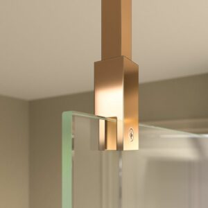 Su belle bordure aspect cuivre (profilé mural et bras de serrage extensible) offre une détail unique et élégant à une cloison d’une seule feuille de verre clair de 8 mm. avec traitement anti-calcaire inclus.