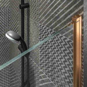 La hauteur de fabrication est de 195 cm mais elle peut être augmentée ou réduite (maximum 220 cm). Quant à la largeur, elle peut mesurer jusqu’à 90cm. Mais allons-y avec ses grands atouts : là l’accessibilité, car il laisse un large trou d’entrée et il n’a pas de profil inférieur (mais il a un caoutchouc à bulles d’étanchéité et dans la zone inférieure un autre caoutchouc et un petit joint en aluminium pour que l’eau ne sorte pas et que la température optimale soit bien conservée); et la facilité de nettoyage (il n’y a pas de profil inférieur, la lame peut être relevée et vous avez la possibilité d’ajouter un anti-calcaire). Ouverture à 180 degrés, à l’intérieur comme à l’extérieur.  Quant aux autres fonctionnalités personnalisables de la paroi de douche OPEN, vous pouvez choisir la couleur et la finition des profils: laqué blanc mat, noir mat, chrome mat, cuivre mat, or mat, or rose mat; ainsi que la finition du verre : transparent, sérigraphié, coloré, mat, translucide, avec verre effet miroir… (voir variations de prix).