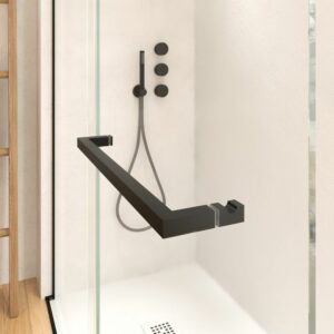 - Même le moindre détail de cette cabine de douche est soigné. La poignée avec porte-serviettes intégré est moderne, pratique (puisqu’elle dépasse à peine, il n’y aura pas de coups dans les salles de bains étroites) et elle est également en acier inoxydable.