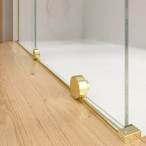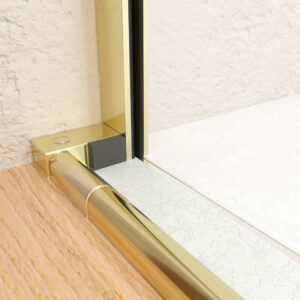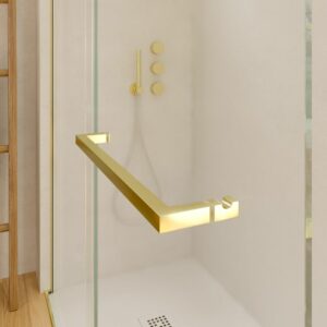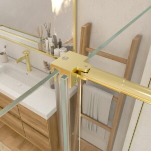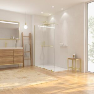 • Paroi de douche avant ouverte avec douche coulissante en verre de 8 mm, finition or mat.