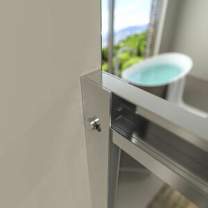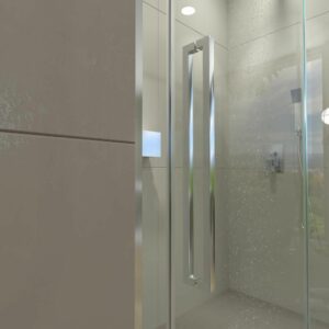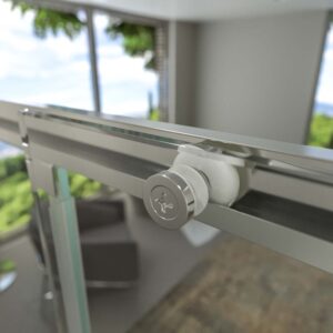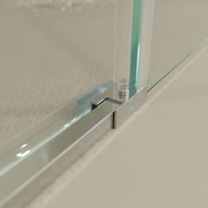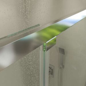 - La façade de douche PETRA couvre une large gamme de mesures de largeur (95-170 cm) et a une hauteur considérable (200 cm), ce qui empêche toujours les fuites d’eau et améliore la continuité visuelle lorsque le verre est incolore. Les roulements de ce modèle, également en acier, ainsi que sa poignée, donnent une glissement silencieux. Le vantail fixe n’a pas de guide inférieur et le vantail coulissant a un profil bas de 1 cm simplement pour assurer l’étanchéité et servir de guide à la porte.