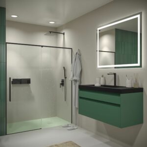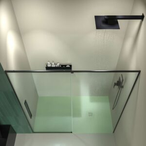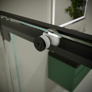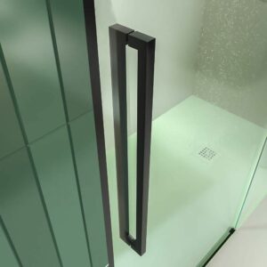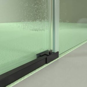 - La façade de douche PETRA couvre une large gamme de mesures de largeur (95-170 cm) et a une hauteur considérable (200 cm), ce qui empêche toujours les fuites d’eau et améliore la continuité visuelle lorsque le verre est incolore. Les roulements de ce modèle, également en acier, ainsi que sa poignée, donnent une glissement silencieux. Le vantail fixe n’a pas de guide inférieur et le vantail coulissant a un profil bas de 1 cm simplement pour assurer l’étanchéité et servir de guide à la porte.