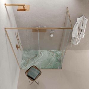 • Les profilés de la paroi de douche d’angle AXER sont en acier inoxydable finition cuivre. Un matériau très résistant à l’usure et à l’humidité.