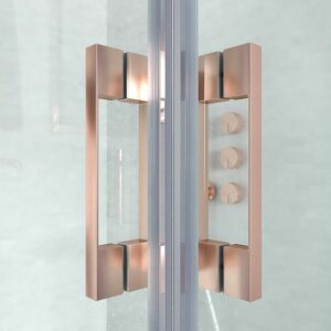 Les profilés de ce paravent de salle de bain sont en aluminium or rose mat, qui, avec les lignes raffinées et sa poignée assortie, confère une sensation d’espace et de lumière à laquelle il est impossible de résister.