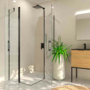 - Douche d’angle avec deux vantaux fixes et deux rabattables. Accès par le haut du plateau.