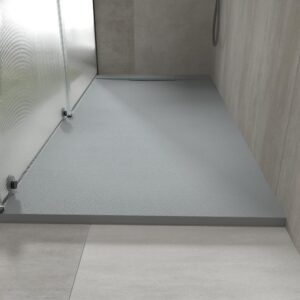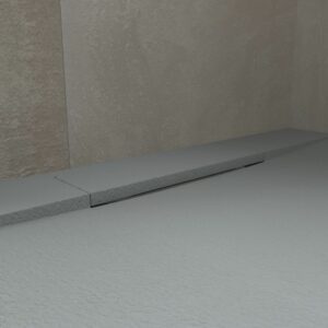 Le receveur de douche réalisé avec les résines modèles de dernière génération PLÂTRE de couleur gris ciment, il présente un design moderne, avant-gardiste et unique. C’est la fusion entre une plaque lisse et une avec cadre. Il est fini en GEL COAT antibactérien et en texture ardoise. Peut être coupé en taille. La grille cache une grande vanne de débit.