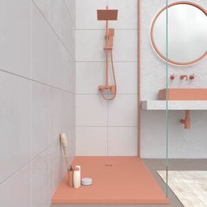 Receveur de douche en résine CLOE Flamingo pink et autres coloris exclusifs avec une texture ardoise antibactérienne et antidérapante. Grille thermolaquée