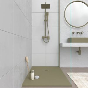 Receveur de douche en résine CLOE Moss et autres couleurs exclusives avec une texture ardoise antibactérienne et antidérapante. Grille thermolaquée