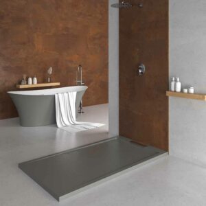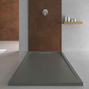 Le receveur de douche réalisé avec les résines modèles de dernière génération STYLE de couleur Cement Grey, il présente un design moderne, avant-gardiste et unique. C’est la fusion entre une plaque lisse et une avec cadre. Il est fini en GEL COAT antibactérien et en texture ardoise. Peut être coupé en taille. La grille cache une grande vanne de débit.
