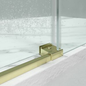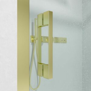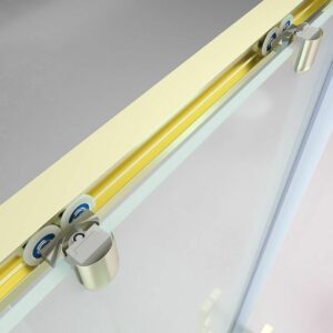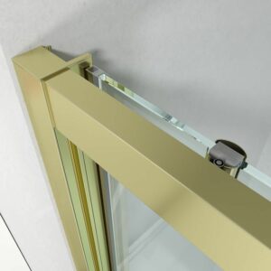 • 1 paroi de douche frontale fixe – 1 porte coulissante sans profilé inférieur or mat, verre trempé sécurit 6 mm, hauteur 195 cm. Installation facile.
